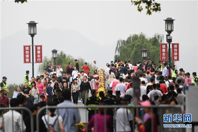 10月7日,杭州西湖風(fēng)景區(qū)的斷橋上游人絡(luò)繹不絕。經(jīng)文化和旅游部綜合測(cè)算,2019年國慶七天全國共接待國內(nèi)游客7.82億人次,同比增長7.81%;實(shí)現(xiàn)國內(nèi)旅游收入6497.1億元,同比增長8.47%。新華社記者 黃宗治 攝