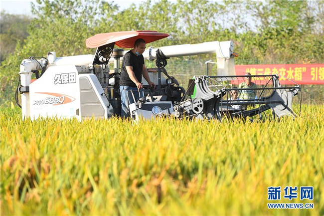 在第三代雜交水稻新組合試驗示范衡南基地一塊被抽取測產(chǎn)的示范田里,工作人員進行機械化收割測產(chǎn)(10月21日攝)。 新華社記者 陳澤國 攝