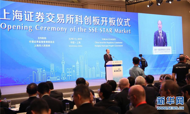 上海證券交易所科創(chuàng)板開(kāi)板儀式在陸家嘴論壇上舉行。這是中國(guó)證監(jiān)會(huì)主席易會(huì)滿在開(kāi)板儀式上致辭(6月13日攝)。新華社記者 方喆攝