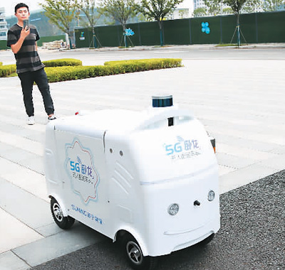 在江蘇南京江北新區(qū)國(guó)際健康城,無(wú)人配送車在送貨途中自主決策躲避障礙。新華社記者 李雨澤攝 |