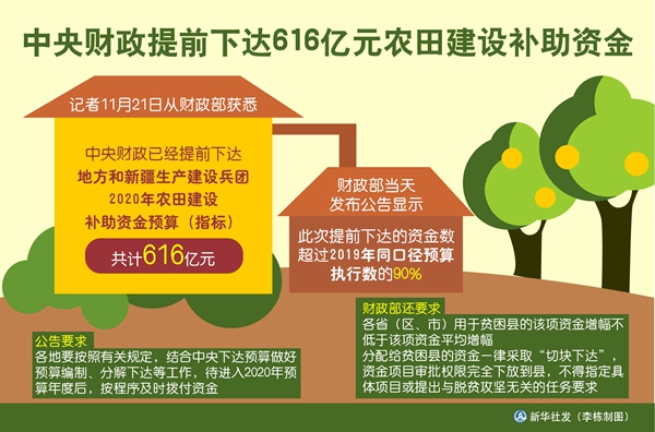 11月21日,財政部發(fā)布消息表示,10月下旬,中央財政提前下達地方和新疆生產(chǎn)建設(shè)兵團2020年農(nóng)田建設(shè)補助資金預(yù)算(指標(biāo))共計616億元,提前下達預(yù)算超過2019年同口徑預(yù)算執(zhí)行數(shù)的90%。