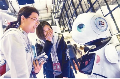 參觀者在北京舉行的2019世界5G大會上了解一款5G機器人。彭子洋攝(新華社發(fā))