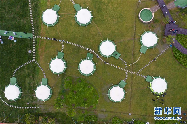 5月31日,空中俯瞰石淙花海內(nèi)的帳篷露營區(qū)(無人機(jī)照片)。新華社記者 徐昱 攝