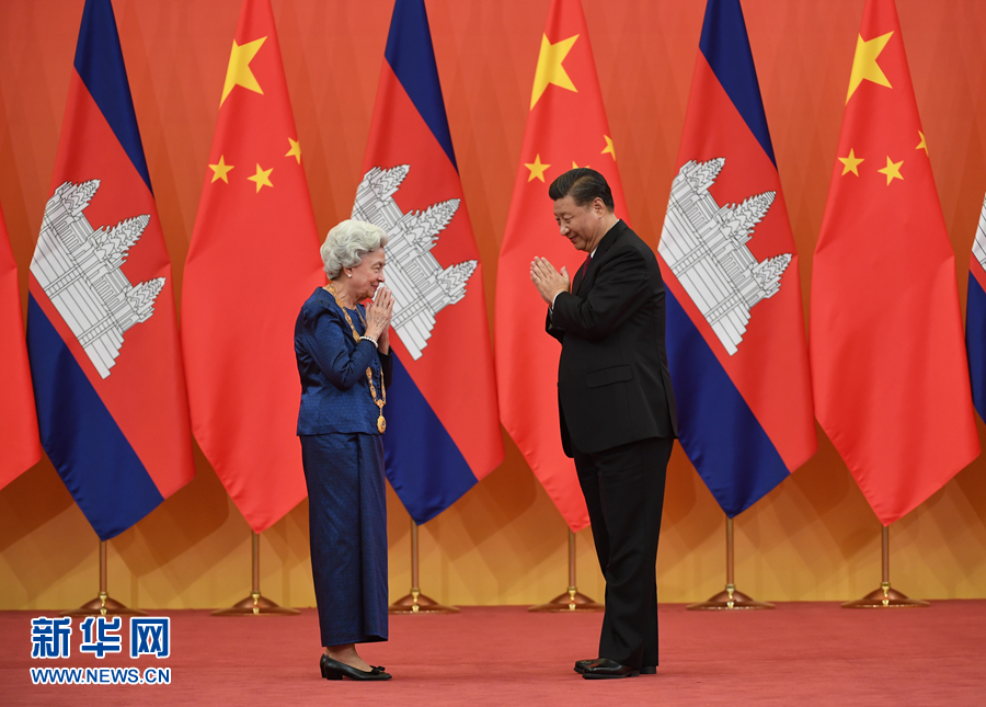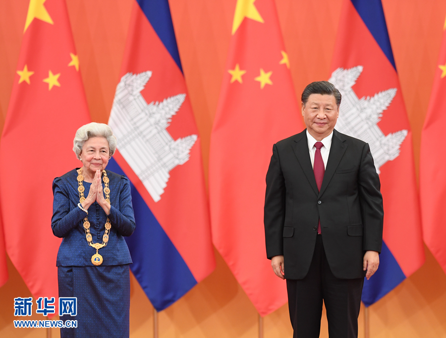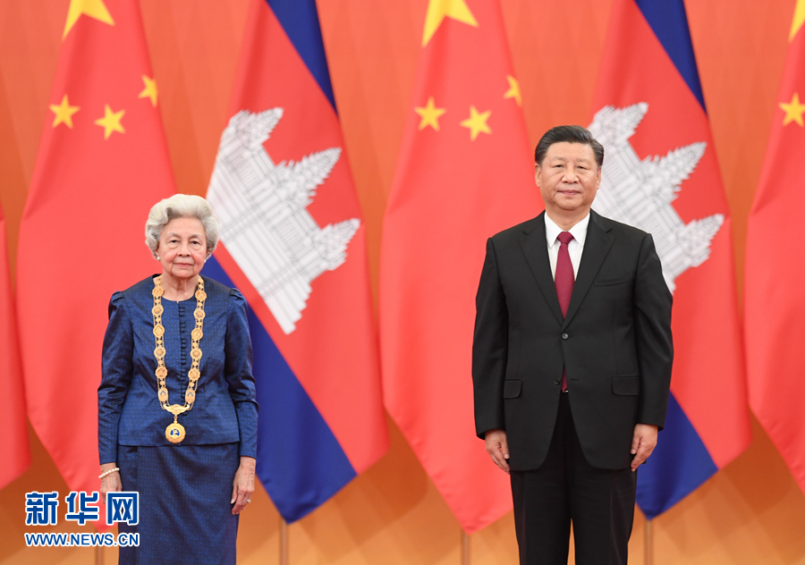 11月6日,國家主席習(xí)近平在北京人民大會(huì)堂為柬埔寨太后莫尼列舉行中華人民共和國“友誼勛章”頒授儀式。 新華社記者 申宏 攝